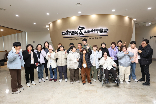 완주군이 기획한 관광복지 팸투어에 참가한 관광객들이 구이면 술테마박물관에서 기념사진을 찍고 있다. 완주군
