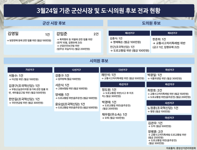 시장 예비후보 가운데서는 강임준 후보(폭력행위 등 처벌에 관한 법률 위반 징역 10월 집행유예 2년, 산업안전보건법 위반 업무상과실치사 벌금 200만원)와 김영일 후보(방문판매 등에 관한 법률 위반, 벌금 100만원)가 포함됐다.