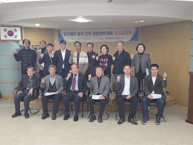 지난해 11월 14일 전북특별자치도청 공연장 2층 세미나실에서 ‘임진왜란 웅치 전적’ 종합정비계획 주민설명회가 열린 가운데 참석자들이 기념 촬영을 하고 있다. /김영호 기자