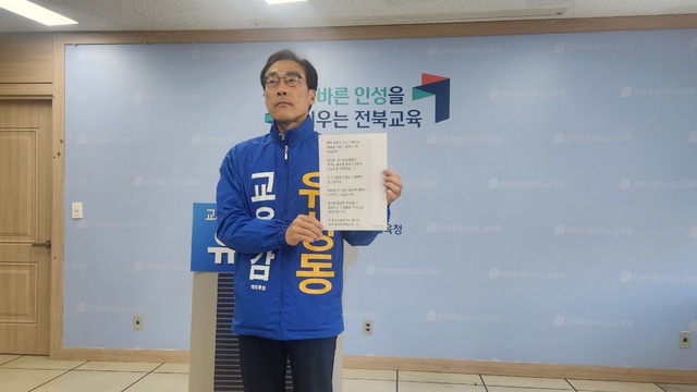유성동 전북교육감 예비후보가 15일 전북교육청 브리핑룸에서 긴급회견을 열고 이남호–황호진–유성동 3자 단일화를 언급한 허위사실 문자 메시지가 시중에 돌았다며 수사기관에 자료를 제출할 것을 밝히고 있다. /이강모 기자
