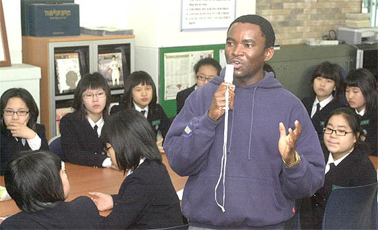17일 오전 전주근영중 2학년 2반과 4반 학생들은 아프리카에서 온 검은 피부의 자원봉사자에게 시선을 빼앗겼다. 이 학교 도서관에서 마련된 이번 수업은 ‘외국인과 함께 하는 문화교실’(CCAP·Cross Cultural Awareness Programme)의 첫번째 프로그램. 학생들앞에 선 자원봉사자는 잠비아에서 온 제레미아 줄루씨(Jeremiah Zulu·30)로, 6개월전 한국에 들어와 신학을 공부중이다. 줄루씨는 학생들에게 한시간동안 잠비아의 역사와 문화 등을 영어로 설명했다. 학생들은 줄루씨의 아프리카식 영어에 가끔씩 웃음을 터트리면서도, 그저 ‘먼나라’로 알고 있던 아프리카에 대한 거리감을 조금씩 좁혀갔다.