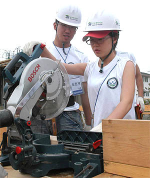 한국해비타트 군산지회가 지난 5월15일부터 오는 9월15일까지 2개동 8가구를 조성하는 '군산 사랑의 마을' 현장. 무더위 속에 망치질로 이웃사랑을 대신하는 일꾼들이 있다. 바로 사랑의 집짓기 운동인 해비타트에 동참해 구슬땀을 흘리는 전국 40여대학 100명 학생들. 한국 해비타트와 포스코가 개인이 제작한 UCC(사용자제작콘텐츠) 심사 등을 통해 선발한 대학생 자원봉사단이다.