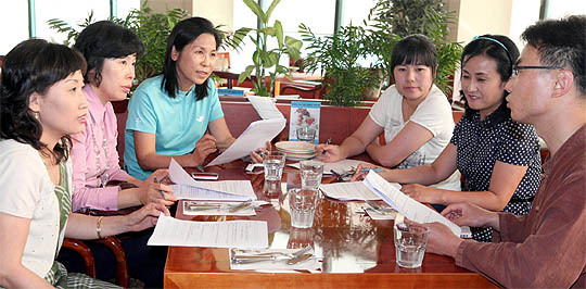 9일 얘·하·밥 운영위원들이 영·유아 유기농 급식을 위한 회의를 하고 있다. 왼쪽부터 원지현 이금선 유혜숙 임화성 김복심 운영위원 장영균 반장 이강민(lgm19740@jjan.kr)