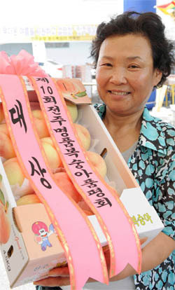 '명품 복숭아 선발 품평회'에서 대상을 수상한 김미영씨.(55·전주시 학정마을) 올해 34년째 원당동 학정마을에서 600평 규모의 복숭아 나무를 작목하고 있다.