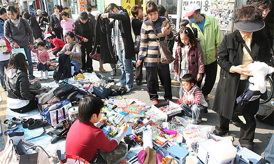 액세서리와 동화책, 잡지와 노트, 구두와 의류 등 집에서 쓰지 않는 헌 물건 등을 팔고 있는 사람들의 호객(?) 경쟁이 붙었다.