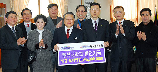 이날 전달된 발전기금은 전북은행에 근무하는 우석대 동문 30여명이 모은 것으로 올해 개교 30주년을 맞는 우석대의 발전과 장학금 등을 위해 조성됐다.