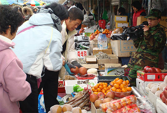 부인과 같이 온 신종식 준위는 "설날 아침에 끓일 떡국 재료를 샀다"며 "주로 대형마트만 다니다 오랜만에 전통시장에 나오니 감회가 남다르다"고 말했다.