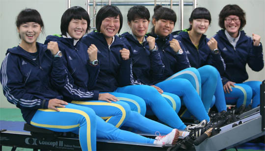 군산시청 조정 선수들이 화이팅을 외치며 밝게 웃고 있다. 왼쪽부터 임지민. 신윤미, 임은주, 최선아, 안민지, 김정임, 김영래선수. (desk@jjan.kr)