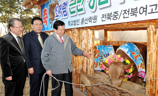 17일 전북여고 교정에서는 '우사신축 및 송아지 입식행사'라는 보기 드문 행사가 열렸다. 훈산학원 윤여웅 이사장이 우석고와 전북여고, 우석중에 각각 한 마리씩 3마리의 한우 송아지를 입식하는 행사였다. 우석여고 한켠에 축사를 마련해 3개 학교의 송아지를 모아 기르기로 한 것. 김희수 도의회 의장과 이의출·김형중·최성배 학교장, 학교 관계자, 제일건설 관계자, 한우협회 관계자 등 100여명이 참석해 행사를 축하했다.