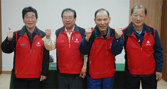 20일 열린 '안골 사랑 효 출동대' 발대식. 왼쪽부터 송영섭, 김정식, 곽종두, 김정한 할아버지. (desk@jjan.kr)