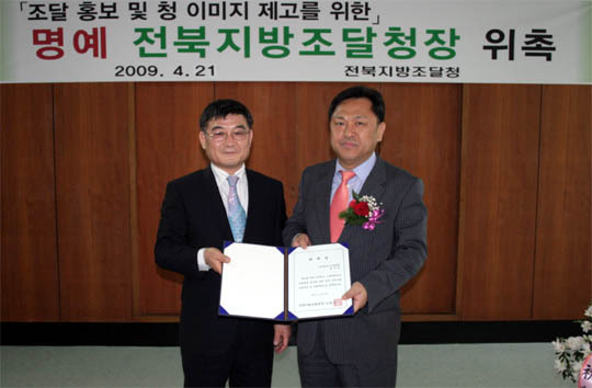 백성일 전북일보 논설위원이 21일 '1일 명예 전북지방조달청장'으로 위촉돼 각종 조달업무를 직접 체험하는 시간을 가졌다. 그는 이날 위촉장 전달과 업무현황 보고에 이어 하루 동안 청장직을 수행하며 결재 등 각종 조달업무를 체험했다.