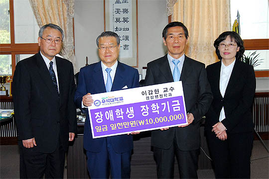 우석대 경찰행정학과 이갑헌 교수(59)가 12일 장애학생들을 위한 장학금으로 사용해 달라며 라종일 총장에게 1000만원을 기탁했다.