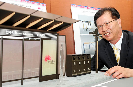 한국디자인진흥원 김현태 원장이 진흥원이 개발한 전주의 새 도시브랜드를 적용해 만든 버스 쉘터 모형을 보고 있다. 이강민(lgm19740@jjan.kr)