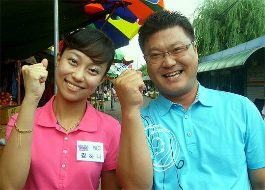 전통시장 살리기의 '전도사'가 된 JTV '와글와글 시장이 좋아'의 두 진행자 임정용씨(38)·강하나씨(24). 두 사람은 시장 어디를 가든 상인에게 인기 최고다. 25일 전주 남부시장에서 촬영이 진행되는 동안 두사람은 상인·시민으로부터 악수·인사를 받느라 바빴다.