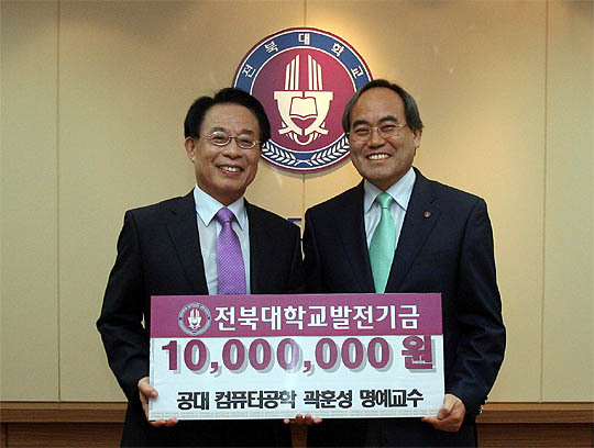 전북대는 지난달말 정년퇴임한 곽훈성 명예교수(컴퓨터공학과)가 10일 오전 서거석 총장을 찾아 대학발전기금 1000만원을 전달했다고 밝혔다.