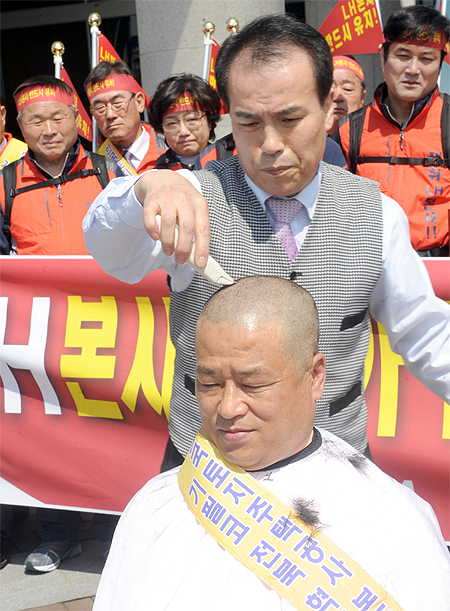 11일 오전 전북도의회앞 광장에서 열린'LH본사유치 염원 마라톤 출정식'에서 도의원들을 대표해 삭발로 비장한 각오를 보여준 조계철 의원(전주 3선거구). 군 제대 후 25년만에 처음으로 빡빡머리가 된 탓에 삭발 직후 다소 어색해한 것도 잠시, 조 의원은 곧바로 동료 의원들의 격려를 받으며 서울까지의 마라톤 장정에 나섰다.