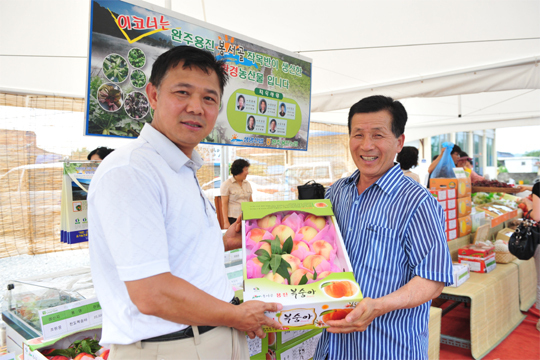 3일 완주군 용진면 상운리 용진농협 하나로마트 앞에 문을 연 완주 로컬푸드 직매장에서 만난 이종대 완주군 복숭아연구회 부회장(64)과 이중진 용진농협 차장(46)은"날마다 아침 10시에 농민들이 직접 채소 가격을 정해 농산물을 진열하고, 그날 안팔리면 폐기처분한다. 하루 지난 채소는 취급하지 않고 당일의 신선한 제품만 저렴하게 판매하므로 전주시민들이 안심하고 사도 된다"고 입을 모았다.