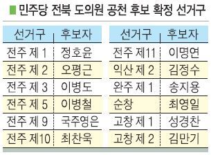 공관위는 이어 35개 광역의원 선거구 중 단독으로 접수가 이뤄진 12곳에 대해서는 이들을 공천후보로 확정했다. 19개 지역은 경선지역으로 확정했다. 이밖에 전주 4선거구와 군산 1·2 선거구, 임실 등 4곳은 정밀심사 지역으로 분류했다.