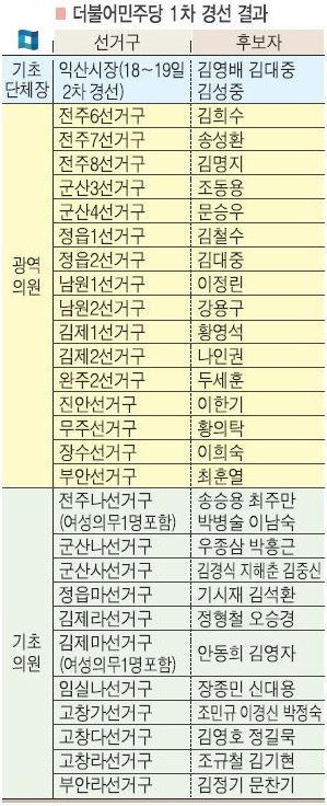 민주당 전북도당 선거관리위원회는 지난 14일과 15일 이틀 동안 진행된 익산시장을 비롯해 광역의원 선거구 16곳과 기초의원 11개 선거구의 경선 결과를 16일 발표했다.
