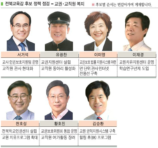 여학생 제자를 성추행했다는 의혹을 받았던 부안지역 교사와 교내 따돌림을 호소한 익산지역 교사가 잇따라 목숨을 끊으면서 촉발된 교사 인권 문제는 이번 교육감 선거의 주요 화두로 꼽힌다. 이에 대해 대부분의 예비후보들은 교사와 학생 인권이 상생하는 학교 인권 향상, 교권침해 대응 법률 및 상담 지원 등의 정책을 제시했다. 또 도서·벽지학교 관사 현대화와 교직원 동아리 활성화·힐링 프로그램 등 교직원 복지 향상 방안도 내놓았다.