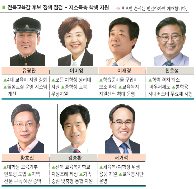 전북교육감 입지자들은 각종 교육비 지원 확대, 학습·생활용품 보조, 복지 사각지대 해소 등을 통해 저소득층 학생과 학부모의 경제적 부담을 덜겠다고 입을 모았다.