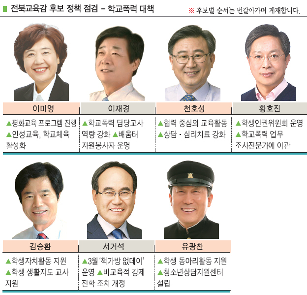 특히 학교폭력 저연령화에 따른 관련 대책이 시급하다는 지적이 나온다. 이에 대해 전북교육감 입지자들은 인성교육 강화와 학생 자치활동 지원, 전문상담사 보강 등을 학교폭력 예방 대책으로 내놓았다.
