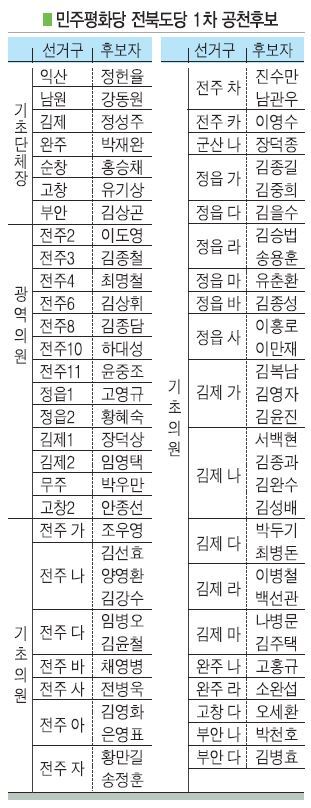 후보 접수가 이뤄졌던 전주 군산 정읍 김제 완주 고창 부안 지역 43곳 기초의원도 확정했다.