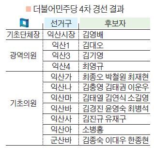 한편 광역의원 경선결과 익산 제1선거구에서는 김대오 후보, 익산 제3선거구 김기영 후보, 익산 제4선거구 최영규 후보가 각각 공천장을 받게 됐다.