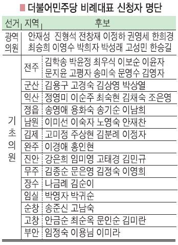 4명을 공천하는 전주는 5명(남 2·여 3), 군산은 3명 공천에 무려 9명(남 4·여 5)이 도전장을 던졌다. 익산은 3명 정수에 남성 1명과 여성 5명이 접수했지만 남성 1명이 24일 등록을 포기해 여성들만 공천장을 놓고 격돌한다. 이와 함께 정수가 2명인 정읍, 남원, 김제, 완주에 각각 5명(남 1·여 4)·4명(남1·여3)·4명(남1·여3)·2명(남여 각 1명)이 등록했으며, 1명을 뽑는 진안 4명(남 1·여3), 무주 4명(여4), 장수 2명(여2), 고창 2명(여2), 부안 3명(여3), 임실 2명(여2), 순창 2명(여2)이 접수했다.