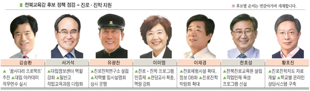 최근 중학교 자유학기제 확대와 대입제도 개편이 추진되면서, 시·도교육청 및 단위학교의 진로·진학 프로그램에 대한 학부모들의 관심이 뜨겁다. 교육부는 대입제도 개편안에 고교 체제 개편, 고교학점제, 내신성취 평가제 등을 포함한 (가칭)교육개혁 종합방안을 오는 8월 말 발표할 계획이다. 전북교육감 입지자들은 학생들의 특기와 적성은 살리면서, 바뀔 대입제도에 능동적으로 대응할 수 있는 진로·진학 프로그램을 만들겠다고 입을 모았다.