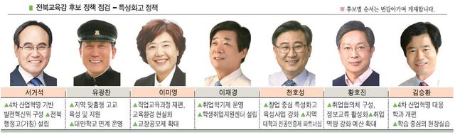서거석 후보는 전북 특성화고 취업률이 전국 최하위권에 그치는 점을 들어 4차 산업혁명 기반 특성화고 발전 혁신위원회를 꾸려 구체적 로드맵을 마련하겠다고 강조했다. 특히 탄소산업 등 지역 첨단신소재 사업과 관련된 특성화고 학과 개편을 추진한다는 구상이다. 그는 또, 부사관과·행정과·사회복지과 등이 설치된 (가칭)전북행정고를 설립하겠다고 밝혔다.