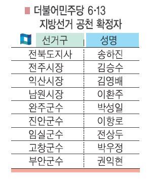 이로써 송하진 지사와 김승수 전주시장, 김영배 익산시장 예비후보, 이환주 남원시장, 박성일 완주군수, 이항로 진안군수, 전상두 임실군수 예비후보, 박우정 고창군수, 권익현 부안군수 예비후보는 민주당 후보로 최종 확정됐다.