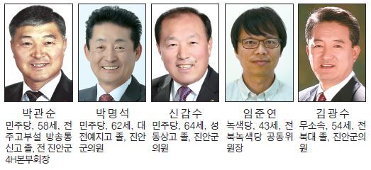 3명의 군의원을 선출하는 진안군 나선거구(부귀·주천·동향·정천·안천·상전·용담) 후보자는 5명. 박명석(민주당), 신갑수(민주당), 김광수(무소속) 등 현직의원 3명이 출사표를 던졌고, 박관순(민주당), 임준연(녹색당) 후보 등 정치 신인 2명이 도전장을 내밀었다. 박명석 후보는 3선, 신갑수, 김광수 후보는 재선을 노린다.