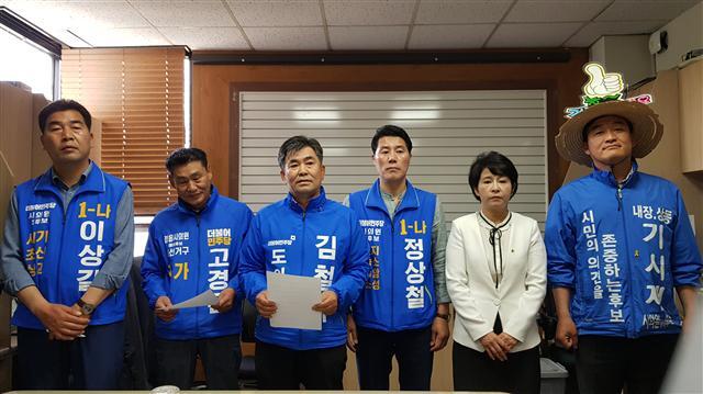 ▲ 15일 김철수 도의원 후보와 시의원 후보자들은 정읍시청 브리핑실에서 기자회견을 갖고 정읍시장 후보를 확정지어 줄 것을 민주당에 요구했다.