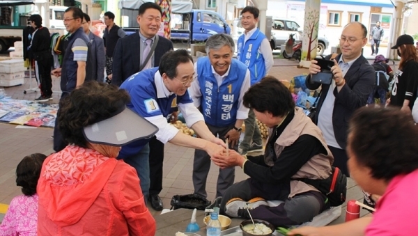 전통시장 찾아 같은 당 지역후보들과 표심공략
