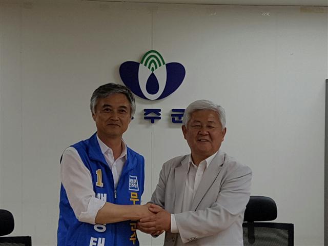 ▲ 백경태(왼쪽)·황인홍 무주군수 후보가 공동기자회견서 손을 맞잡고 있다.