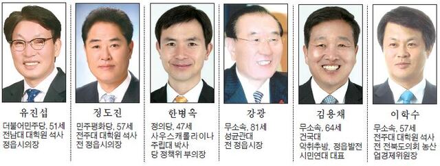 당초 5파전에서 6파전으로 전선이 확대된 정읍시장 선거에는 후보등록 마감 결과 민주당 유진섭, 평화당 정도진, 정의당 한병옥, 무소속 김용채, 무소속 강광, 무소속 이학수 후보가 도전장을 냈다.