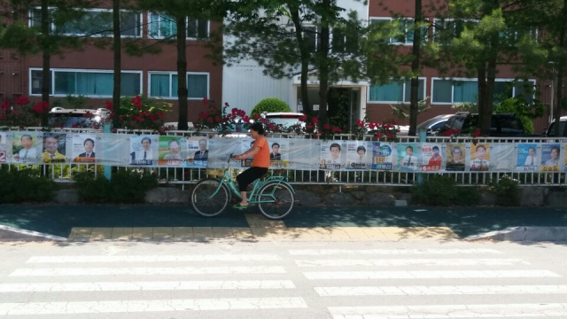 ▲ 자전거를 탄 남원시민이 도통동에 내걸린 선거벽보를 무심히 지나치고 있다.