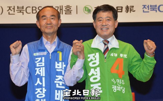 ▲ 4일 전북일보·전북CBS가 공동 주최한 6·13 지방선거 김제시장 토론회에서 더불어민주당 박준배 후보와 민주평화당 정성주 후보가 화이팅을 외치고 있다. 박형민 기자