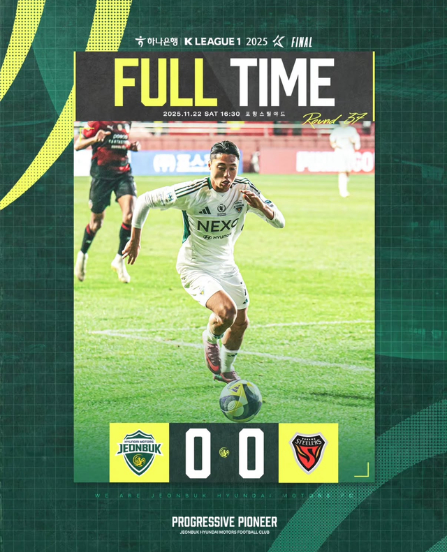 전북은 22일 오후 4시 30분 포향스틸야드에서 열린 하나은행 K리그1 2025 파이널A 37라운드에서 포항을 상대로 0-0, 아쉬운 무승부를 거뒀다. A매치 휴식기 이후 2주 만의 리그 경기다.