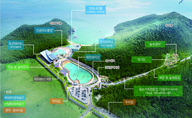 이곳 해양레저체험단지는 6만4365㎡ 규모로 △서핑·잠수 등 해양스포츠를 즐길 수 있는 ‘오션에비뉴’ △샤워실·푸드코트 등 편의시설을 갖춘 ‘오션테라스’ △몽돌해변 전망을 즐기는 ‘인피니티풀’ △최대 3m 인공 파도를 구현한 ‘파도풀’ △카누·카약 체험이 가능한 ‘레저레이크’△휴식과 체류 가능한 ‘숲속 캠핑장’ 등 다채로운 공간으로 구성됐다.