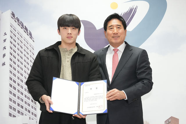 우석대학교 신민준 학생이 화재 현장에서 신속하고 침착한 초기 대응으로 피해 확산을 막은 공로를 인정받아 대학 특별상을 받았다. 박노준 총장과 신민준 학생이 기념촬영을 하고 있다./우석대 제공