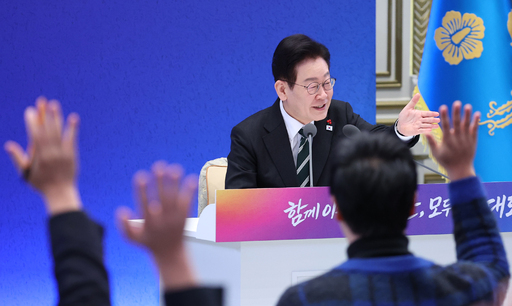 이재명 대통령이 21일 청와대 영빈관에서 열린 신년기자회견에서 취재진 질문을 받고 있다. /사진=연합뉴스