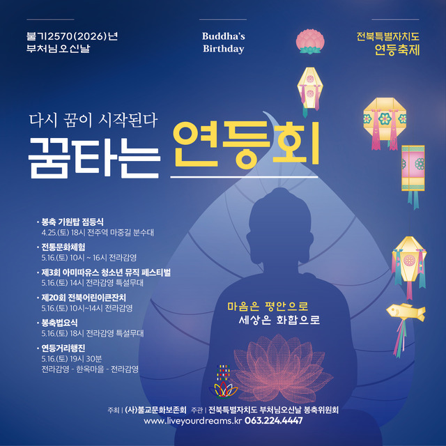 주요 프로그램인 ‘꿈타는 연등회’는 다음 달 16일 전라감영 일원에서 진행된다. 행사에서는 전북어린이큰잔치 (사생대회)와 더불어 제3회 아미따유스 청소년 뮤직 페스티벌 본선 경연을 비롯해 전통문화체험마당, 한지등 만들기 강습, 수수팥경단 체험 등 다채로운 참여형 프로그램이 운영된다.